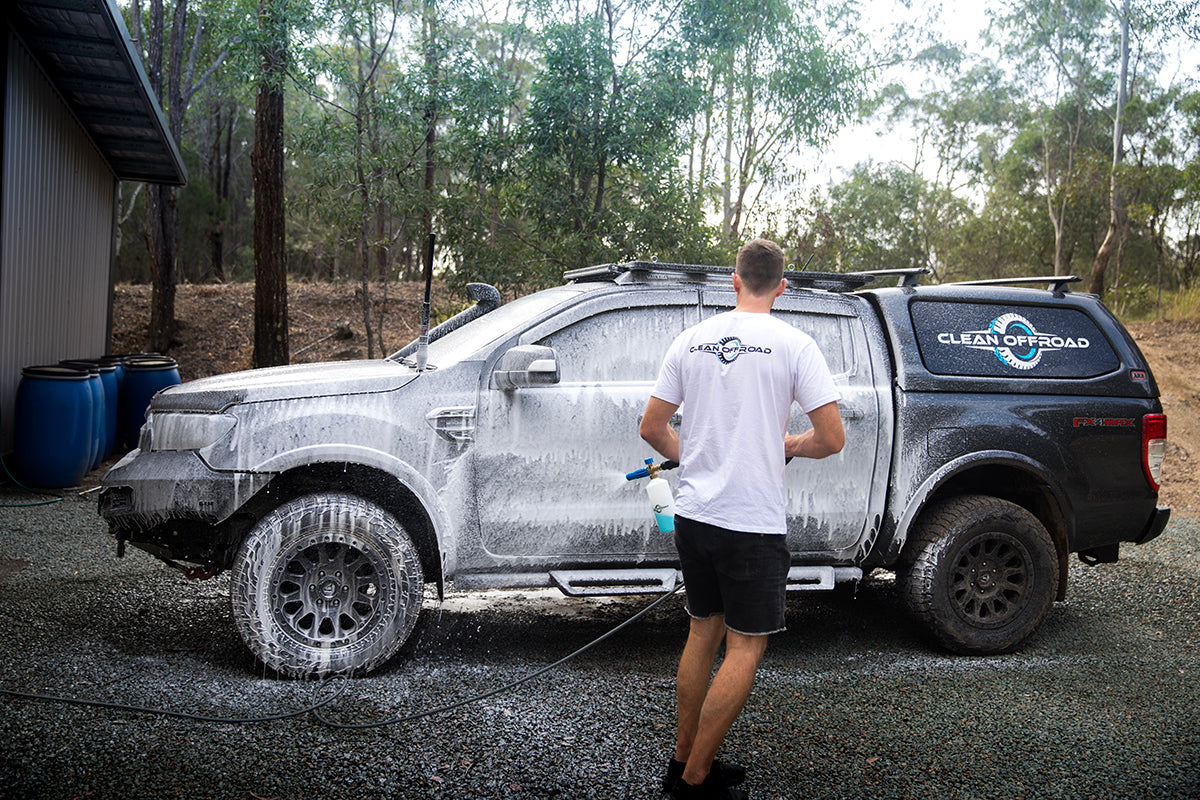 SOAK & WASH : Apply foam to dirtier areas first then work your way up to the roof. Leave foam to sit for a 3 to 4 minutes for the wash to dissolve all mud and salt (Do not allow to dry.)