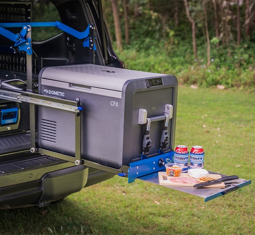 Perfect for preparing a quick meal for the family when on the road. The Drop SlideTM lowers 30 centimetres while extending over the tailgate of the vehicle, allowing easy access to a fridge, toolbox or generator. The slide remains in a horizontal position when lowering, avoiding any contact with the vehicle.