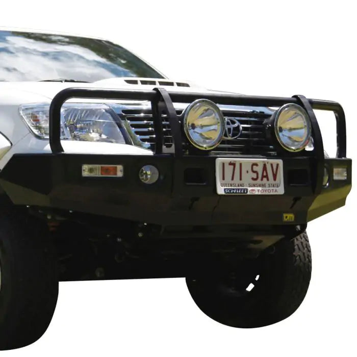 The genuine TJM Outback bull bar range offers exceptional frontal protection for your Toyota Hilux. Our engineers have spent countless hours perfecting the design of these bars to ensure our customers are equipped with one of the finest products in the market. Full wrap cato straps and 50mm outer pipework provides added strength, damage deflection and headlight protection. This TJM Outback bull bar is 4x4 equipped with a steel winch-mount, LED combination lights, and reinforced T-slot recovery jack points. It's ready to work for you with dual aerial mounts and mounting points for installing large driving lights. Add our optional LED fog lights to see on those foggy mornings. Combining premium features, TJM's Outback bull bar range offers uncompromised frontal protection for your 4x4. Take the Lead.