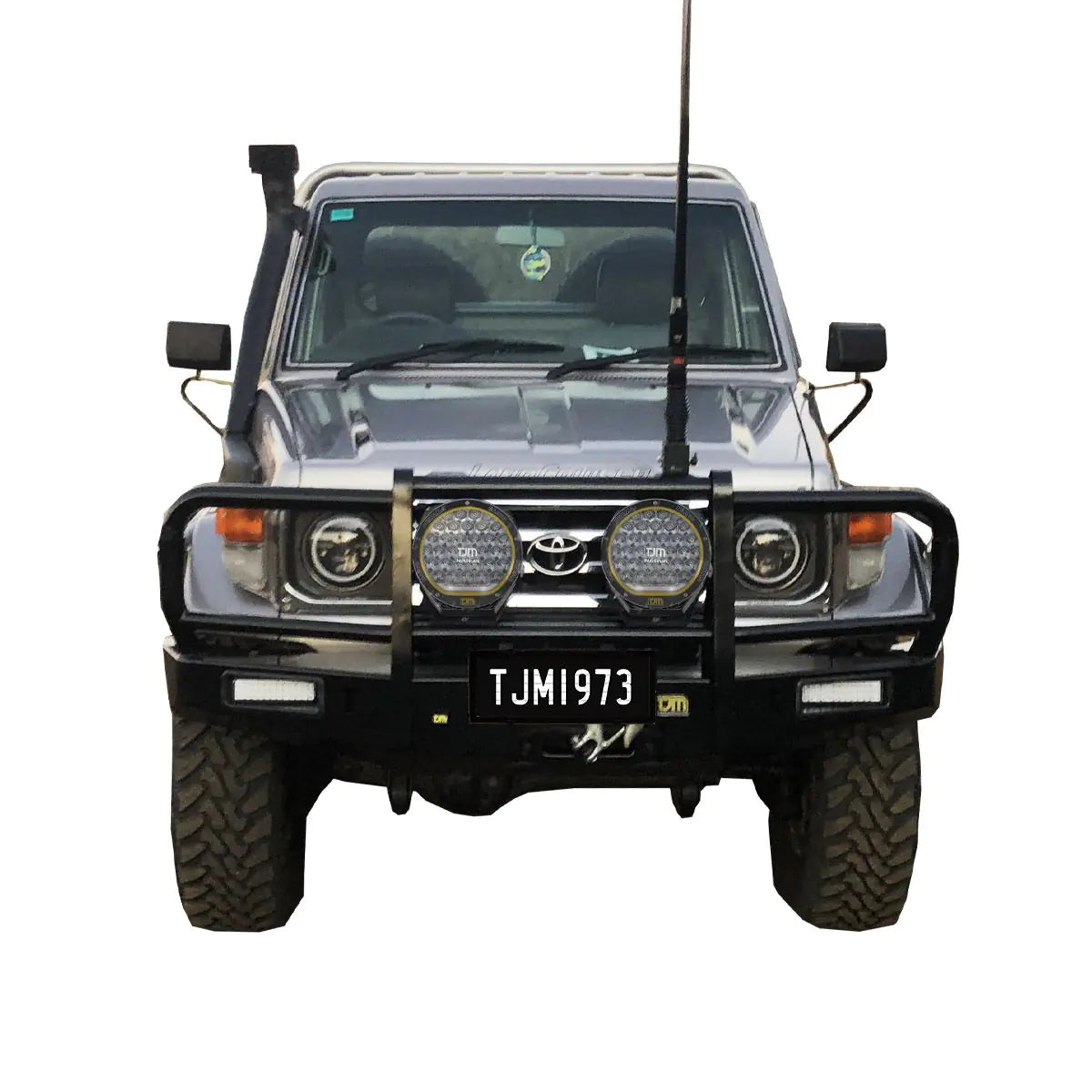 The genuine TJM T13 bull bar range offers exceptional frontal protection for your Toyota. Our engineers have spent countless hours perfecting the design of these bars to ensure our customers are equipped with one of the finest products in the market. Full wrap cato straps and 50mm outer pipework provides added strength, damage deflection and headlight protection. This TJM bull bar is 4x4 equipped with a steel winch-mount, combination lights, and reinforced T-slot recovery jack points. It's ready to work for you with dual aerial mounts and mounting points for installing large driving lights. Combining classic styling with premium features, TJM's bull bar range offers uncompromised frontal protection for your 4x4. Take the Lead with TJM.
