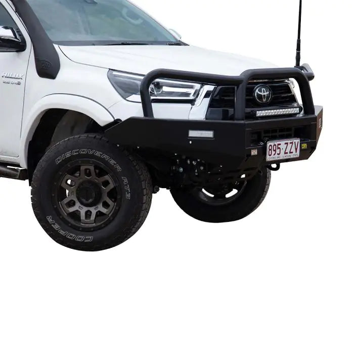 TJM's genuine Tradesman bull bar blends style and features at a great price for your Hilux. The TJM Tradesman bull bar is 4x4 equipped with a steel winch-mount, integrated rated recovery points, LED combination indicator park lights, and reinforced T-slot recovery jack points. It's ready to work for you with dual aerial mounts and mounting points for installing driving lights and LED light bars. A stylish 76mm centre tube and 63mm outer tubes offer strength and help protect your vehicles headlights. Tapered side-wings assist with approach angle when off-road and taking on rises in the terrain. Thick steel tubing provides first-class protection and comprehensive engineering offers peace of mind with ADR compliance and air bag compatibility. Take the Lead with TJM.